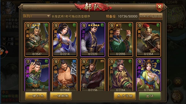进入武将队列后,可以根据自己的爱好和武将技能组合来编排阵容,官位在县长之前都是最大限制6位武将出兵攻打敌国,组编好武将队列后,记得要保存好哦。