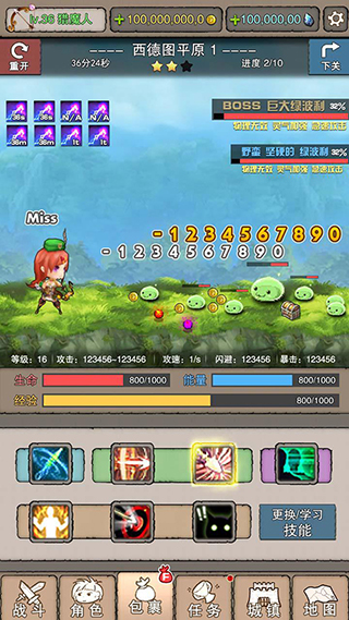 在战斗界面的上方是玩家的金币和钻石,中间就是华丽的战斗界面,战斗界面的下方可以看到玩家的攻击,攻速,闪避和暴击值!