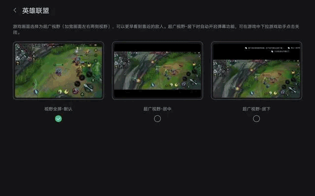 在拯救者 Y700 为我们带来更大显示面积的同时,也因为屏幕比例与手机不同,在 MOBA 类游戏中游戏的视野会和手机有一定的区别,针对不习惯的玩家,拯救者领域为我们带来了超广视野功能,通过改变游戏画幅比例,使得平板可以获得与手机相同的视野,保持了同款游戏在多设备间的一致表现。