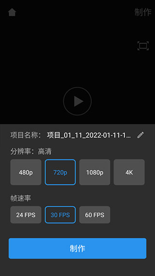 5、点击右上角的制作,选择保存你的视频分辨率及FPS;