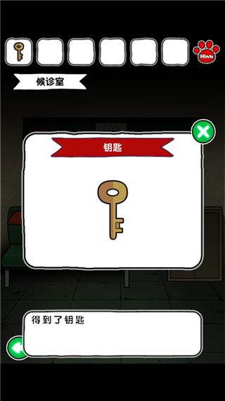 1、向右走两步,来到候诊室,点击左侧红色坐垫,拿走底下的钥匙。