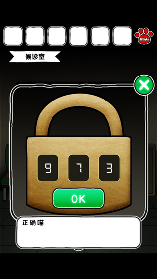 8、用剪刀剪开候诊室椅子上右边的红色坐垫,得到一张写着973的字条;