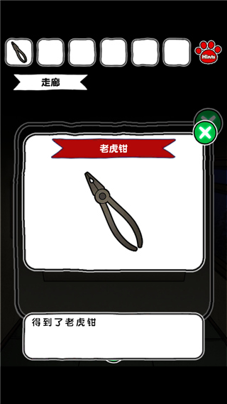 2、回到走廊,用钥匙打开左侧小箱子,得到老虎钳。