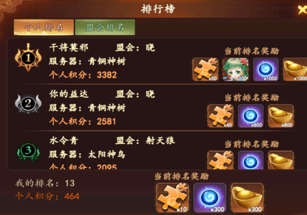 7、御灵师参与战斗可获得城池争夺积分,积分自动发放,每轮城池争夺,会根据个人积分和盟会总积分进行排行,可以获得丰富的排行奖励。排名第一更可以获得SSS伙伴!