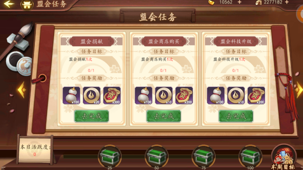每天完成盟会任务,可以获取盟会经验,贡献,活跃,本日活跃达到一定阶段可以领取宝箱奖励,盟会所有成员的活跃度会有本周目标,当盟会活跃度达到本周目标时会在周一0点通过邮件发放丰富奖励。