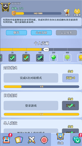 公会位于第五栏,玩家可以创建自己的公会,公会版块中从上到下依次是【公会ID/头像】【公会等级】【公会管理】【公会荣耀榜】【公会聊天/互助/任务】,其中完成公会任务可以获得金币、钻石和宝箱等奖励,公会互助功能可以让玩家之间交换得到自己想要的布洛克。