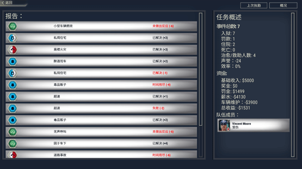 3、游戏还有着救援人员伤亡的设定。如果你不看事态,盲目派出数量不合理的救援人员,或者不对应任务类型的救援人员,等待你的将会是救援队伍的大量人员伤亡,导致下一关你有车但就是用不了。游戏亦对载具的载员数量进行了设置,比如警用摩托车不可运载罪犯,这就意味着你需要调动载具资源,合理运送病人或罪犯。