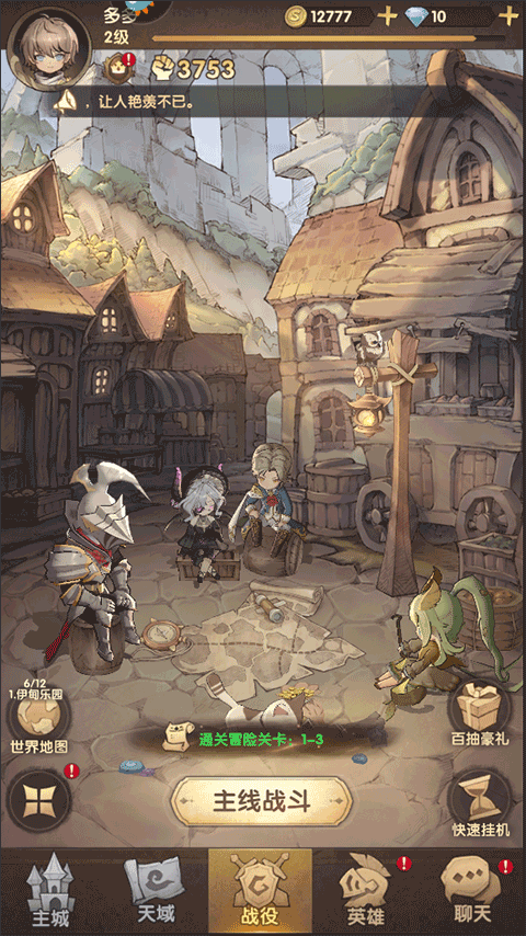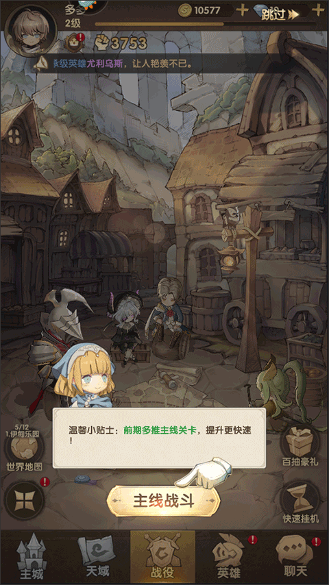 1、运行游戏后,在升级完英雄后,游戏就正式开始了,我们可以选择主线战役继续战斗;
