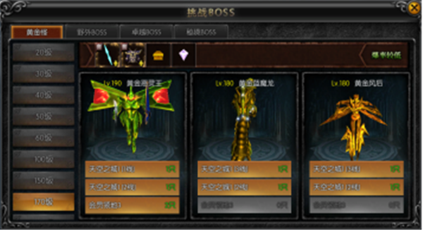打开【挑战BOSS】页面,映入眼帘的是四个BOSS的分块,分别为黄金怪、野外BOSS、卓越BOSS及秘境BOSS。挑战BOSS页面是为了方便大家查看BOSS、直接点击寻路使用的,避免过度搜寻影响大家体验。