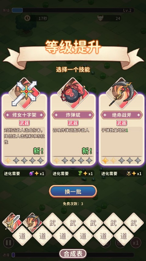 类似《吸血鬼幸存者》一样的超武进化,在“合成表”中可以查看,相比之下,这款游戏的出现点显得更加容易。