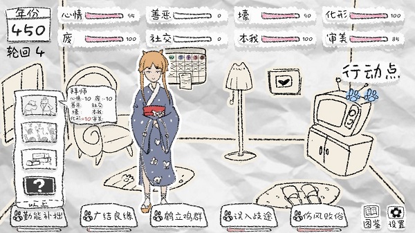 狐里狐涂游戏是一款手绘画风的休闲模拟类游戏,游戏风格独树一帜,玩法特色也极具亮点,在这里玩家所扮演的狐狸有着各种类似拟人化的属性存在,如心情、善恶、壕、化形、废、社交、本我及审美,在此期间你所经历的种种事件和选项,都会改编属性的数值,在结合了回合制的策略玩法后,让游戏特色变得更加与众不同,同比修仙题材的玩法模式,玩家需要在不同的项目活动中来规划你的行动指令,最终的最后篇章来完成渡劫升华。总的来说,这款狐里狐涂游戏题材新颖,里面包含的众多成就也有着更加开放性的结局等你探索和发现,便捷的简单操作,只需轻轻按下按钮即可修炼,若有感兴趣的朋友就抓紧时间来下载体验吧!