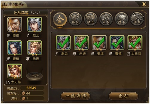 值得一提的是,一定要勾选上兵种和数量尽可能多的武将,并根据各个武将的兵种排好阵势。当然,比较懒的玩家也可以直接点击【一键布阵】啦。像上面这样不仅兵种齐全,而且能提高总战力,以便在沙场上见招拆招,所向披靡!