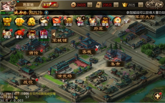 在城池中可进行酒馆招募、客栈宴请、集市购买道具、参与演武竞技、购买资源及参与战役活动。在世界地图中可进行关卡挑战,参与城战,拜访武将。
