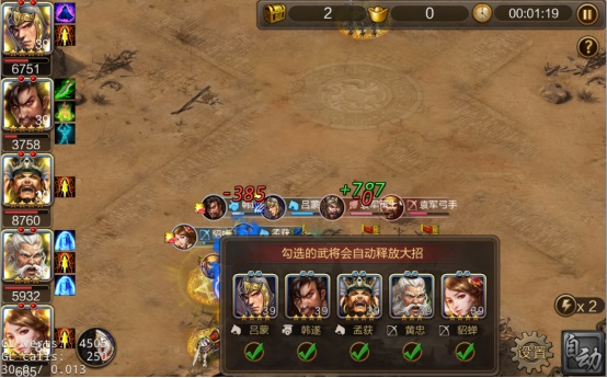 界面左侧有5个头像,分别对应出战的5名武将。武将在战场中会自动累积战意值,当战意值满之后,武将头像会变亮,此时点击头像,对应武将即可释放武将技。