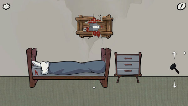 用锤子砸卧室的墙。看见保险柜。根据床头的4,报纸上的2,浴室镜子上的6,冰箱里的1得出密码是:4216。这时候输入密码还不能打开。