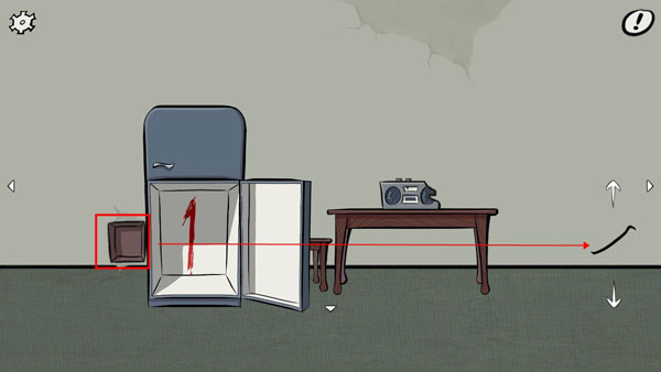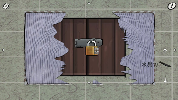 点击卧室地上的三角形,然后用水果刀划开,看见锁。根据有花瓶的柜子上的报纸的提示和有冰箱的房间桌子上照片的提示(日期最后一位),得出密码是:7391。输入密码就进入地下室了。