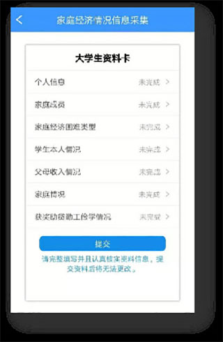 1、进行家庭经济情况信息采集,只需要按要求填写指标,提交审核即可;