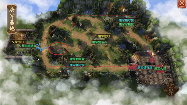 从地图上看,其中红线部分是比较安全的行进路线,红圈部分属于战斗区,如果不想杀人就绕开吧。红线路线一般来说没人堵路,有的话也只有1,2个,击杀就好,不行就跑,除了奶妈吸血很烦外基本都还是能跑掉。