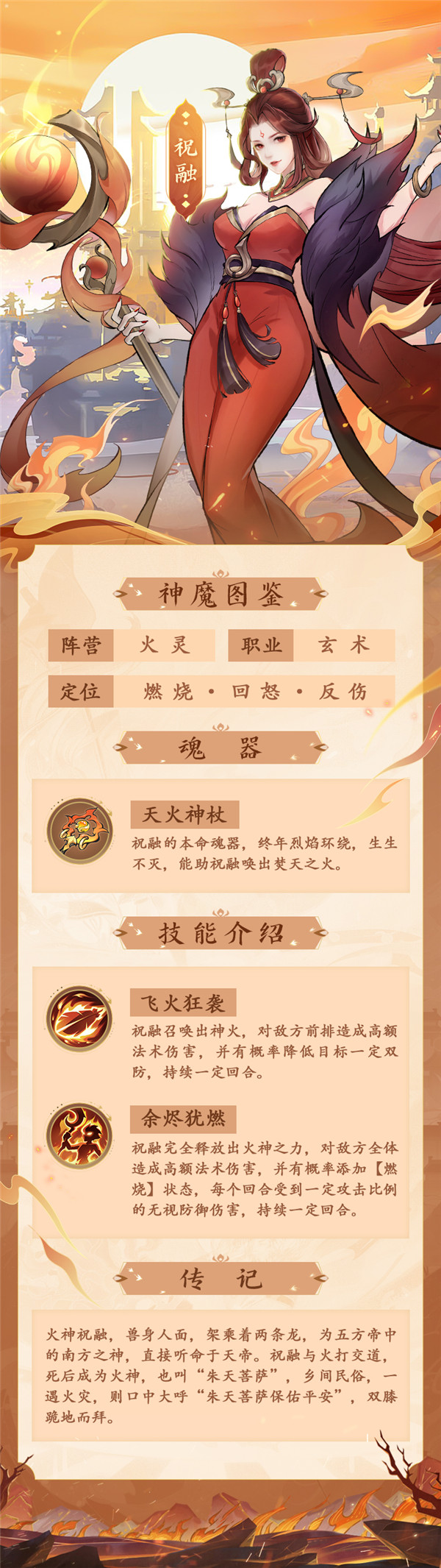 祝融为火系输出神卡,在队伍中处于核心输出位置,有强大的群体输出和群体点燃能力。