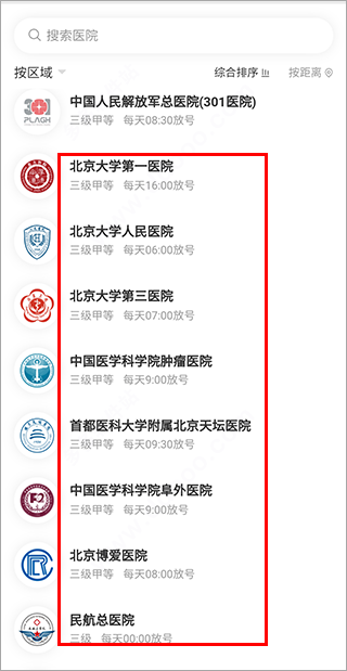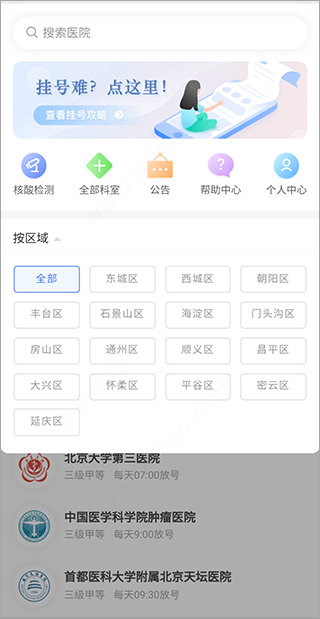 2、同时也支持根据区域来选择寻找医院;