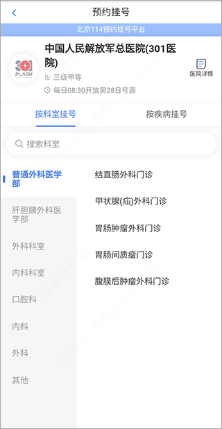 3、点击想要挂号的医院后还可选择科室;