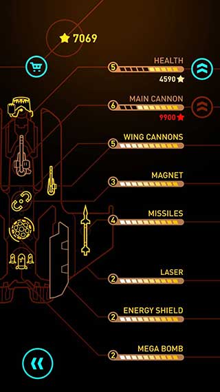 4、升级你的护盾、主炮、导弹、激光、超级炸弹还有磁铁。