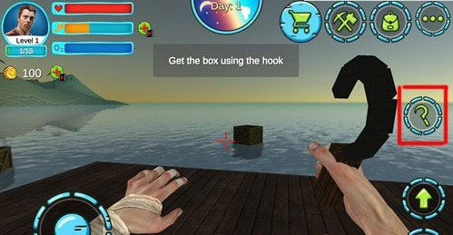 点击屏幕右侧的“挂钩”按钮,可以将挂钩拿在手中丢出去勾海面的木箱。