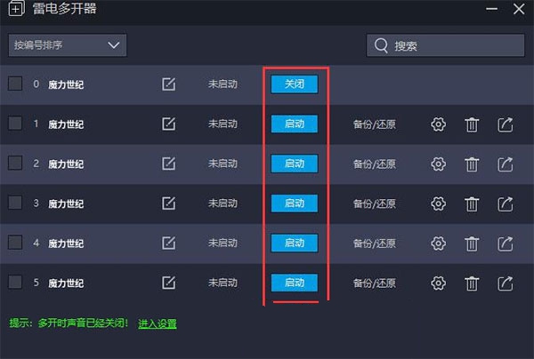 完成以上步骤,返回雷电多开器首页你就会发现刚刚配置的环境已经都列在这里了,点击“启动”运行电脑版就好,要开几个魔力世纪就运行几个模拟器环境。如图所示: