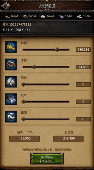 升级商会建筑可提高输送资源的总量和降低输送的税率。