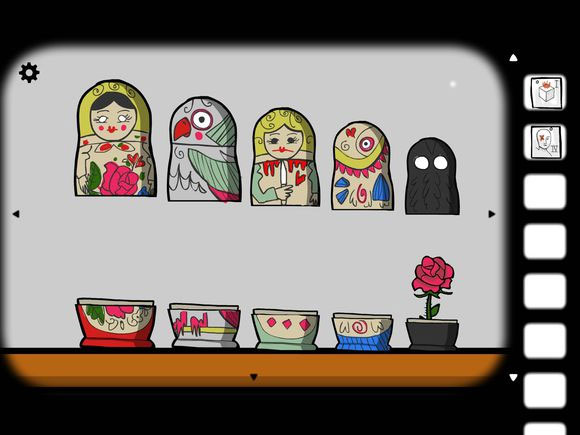 7、点击柜子中的套娃,依次将它们摆出来。在黑影套娃里是花,把花移到女人套娃上合住,再打开就是鱼,以此类推,最后得到钥匙。