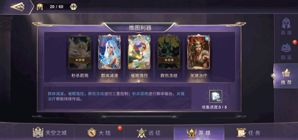 此外,在图鉴中能查阅到所有可以获取的英雄。集中精力优先收集合适的推荐搭配阵容,根据自己的需求组建通关、塔防、PK、防守等多套不同功能的阵容,运筹帷幄!