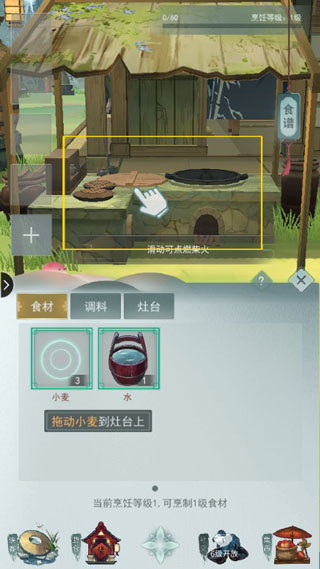 拖动食材至灶台之上,滑动点燃柴火,多次滑动即可完成美食烹饪。
