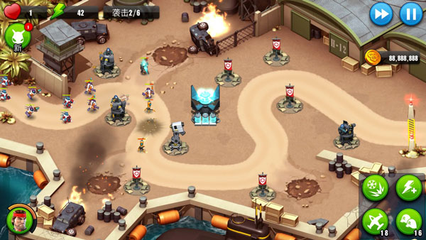 这是一个塔防游戏,那么它能放防御塔的位置就是固定的了,我们只要在一些规定好的位置上面选择好防御塔的各种种类就好了,主要就是控制好自己的兵和防御塔一起结合起来,计算好各种塔的伤害。我们只要遵循一个定律“机枪塔用来打输出,卫兵给来充当肉盾”前期基本都可以顺利的通关。