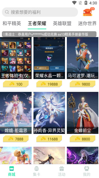 2、在商城这里,用户可以通过迷你点兑换稀有皮肤,支持和平精英、玩着荣耀、英雄联盟、迷你世界、摩尔庄园、奥特曼传奇英雄等多种热门游戏;