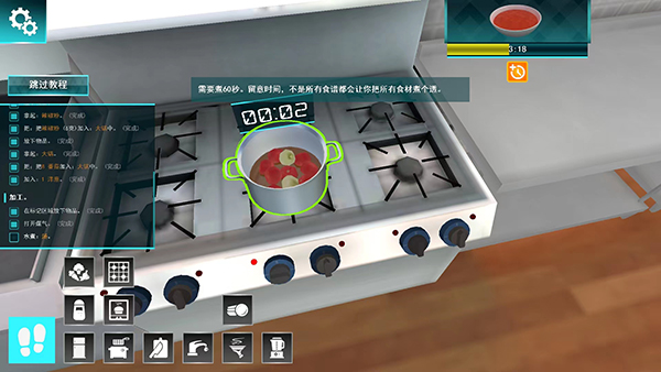 4、拿起物品后,再点击空白的地方即可进行放置,接着我们来练习第一道菜,番茄浓汤,