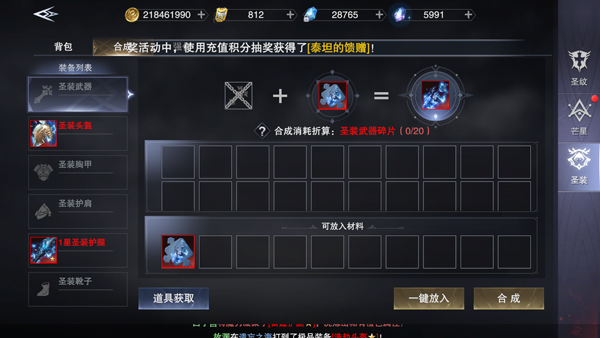圣装的强化相对简单,升星只需要碎片即可。有条件的玩家可以将腰带、副手2件提前练满,其他部位慢慢培养升级!