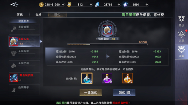 圣装主要通过“强化”和“升星”两个方式进行提升。强化需要消耗“圣装精华”,强化等级越高,圣装的基础属性就越高。升星则需要在已装备圣装的基础上,消耗同部位的圣装碎片,或成品圣装合成升星。激活星级属性的同时,也会提高其基础属性,套装属性的种类和数值也会改变。