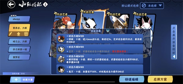 这里可以看到,由于阿力和伊鹤想要触发援护技第二词条的效果,必须放在叁号位,而我又要同时上阵阿力和伊鹤,于是只能退而求其次,将阿力放置在对小队影响最小的贰号位上,当然我们也可以放在壹号位、肆号位,只不过相对来说我会做此种调整,无双图由于忍术节奏较慢,我比较青睐神炎小椒的援护技(进入boss战斗后,每5秒提升20点,最高提升200点);而在肆号位我选择了对妖鬼有攻击力提升的鬼狩苍牙的援护技。综上所述又得出了这样一套搭配。