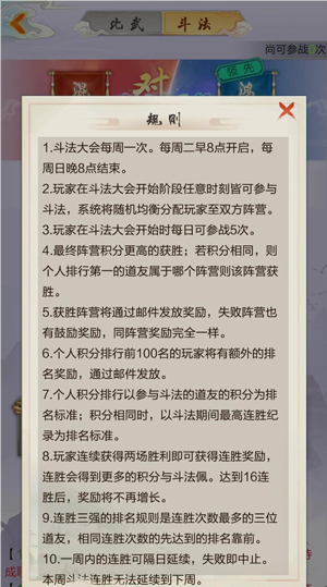 1、类似于其他游戏的竞技,活动时间是每天8点—23点,每人有20次的挑战机会,最多可失败5次,若是5次失败都用完了,即便还有挑战次数也没法继续比武了。
