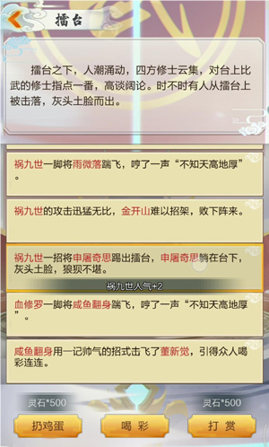 3、其他增加人气的方法。除了连胜,打赏和喝彩也可以增加人气,当然扔鸡蛋可以给别人减人气(强烈不推荐这种损人利己的行为,修仙修心,不要为了一点点小利就损害他人的利益)。一个号,每天可以打赏5次(免费不花钱的)、喝彩5次(每次500灵石)、扔鸡蛋5次(每次500灵石);1次打赏+2人气,1次扔鸡蛋-2人气,1次喝彩+1人气。