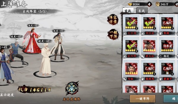 拥有不错的侠客之后,我们就可以根据侠客的属性组建自己的初始阵容。游戏分为掌、剑、力、气、技五中职业,前期阵容以平衡为主,最好每个职业的侠客都能有一位在阵容中。组建好阵容后,我们就可以对侠客进行强化了。点击屏幕下方的侠客按键,进入侠客选择界面,选择我们要强化的侠客进入强化界面。