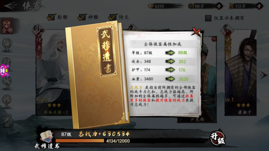 除了提升单体侠客的战力之外,还可以通过提升所有侠客的总战力,为自己的侠客提供属性加成。可以通过招募收集更多的侠客,同时适当分配资源提升其他侠客的战力,来升级武穆遗书,武穆遗书的等级越高,能够给予侠客的战力加成就越大。