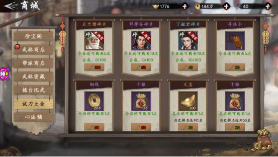 挑战获取的声望,可以在擂台比武商城兑换奖励。值得注意的是每种道具每日限定购买次数,大侠一定要合理分配手中的声望值,避免浪费。这里推荐优先兑换侠客碎片,毕竟好的侠客在挑战中会起到更关键的作用。