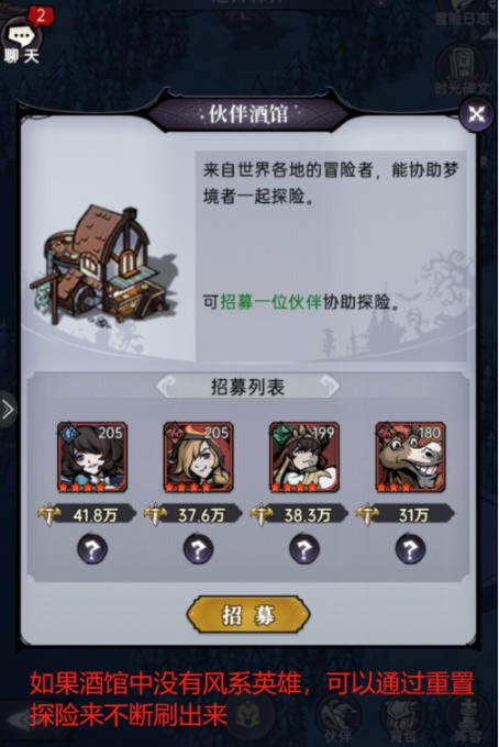 (2)第二步:与森林之风的使者进行对话,对话结束后需要上阵5位风系伙伴,击败使者;如果风系伙伴数量不够,可以在左上方的小酒馆招募1位风系伙伴(若酒馆中没有合适的风系伙伴,可以通过重置探险来刷新酒馆伙伴)。