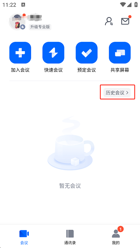 1、打开腾讯会议app,点击【历史会议】。