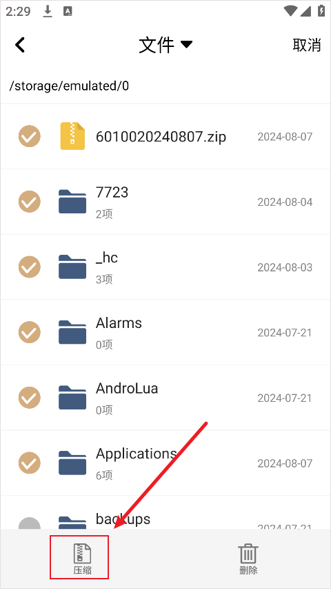 2、然后点击右上角的【选择】选中你需要压缩的文件