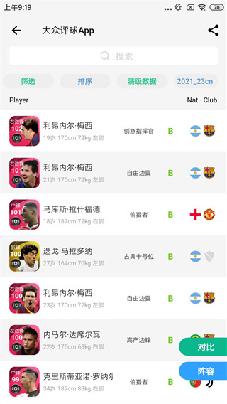 该应用程序还新增了比较球员的功能,用户可以很方便地比较不同的足球运动员之间的各种数值,从而更加直观地了解他们的表现情况;