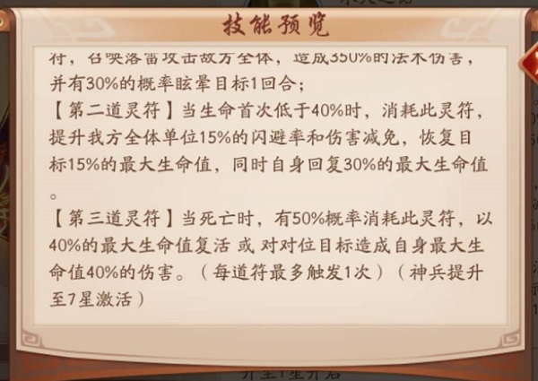 【第二道灵符】:当生命首次低于40%时,消耗此灵符,提升我方全体单位10%的闪避率和伤害减免,恢复目标单位8%最大生命值,同时自身回复15%的最大生命值。