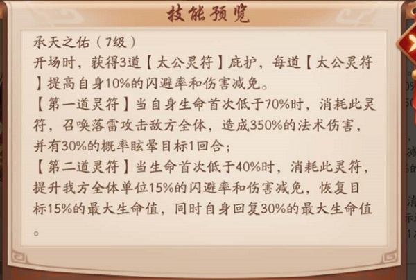 开场时,获得3道【太公灵符】庇护,每道【太公灵符】提高自身10%的闪避率和伤害减免。