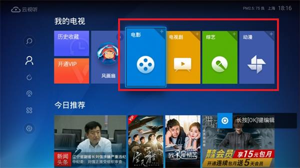 1、进入首页,将光标移动到某个模块(首页四个模块都能自由替换,这里以电影为例);